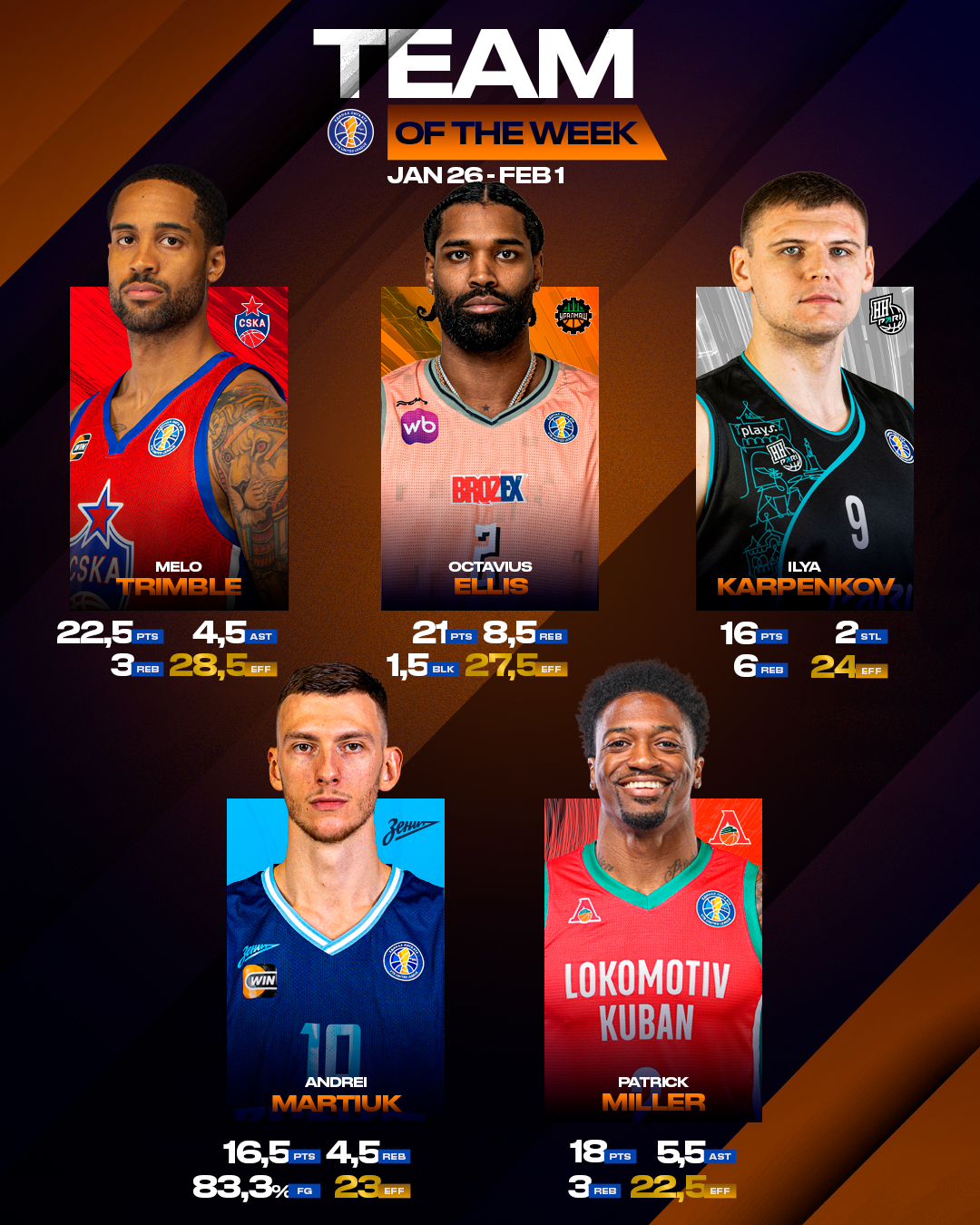 По итогам матчей 26 января – 1 февраля составлена символическая пятерка лучших игроков недели.